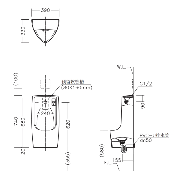 小便斗洒水器、固定挂板组、小便斗落水管(P型)