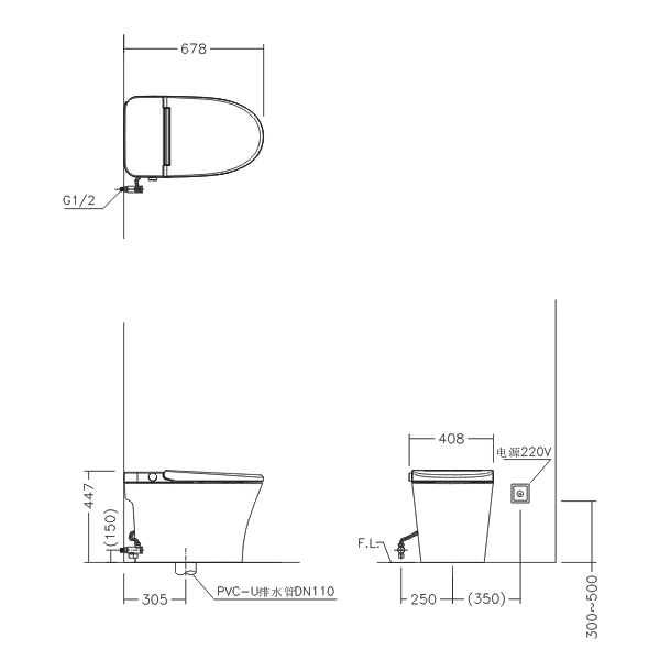 ● 两档暖座 ● 白光夜灯 ● 着座润壁、离座冲水 ● 停电冲水、脚触(微波)冲水 ● 脉冲阀式喷射虹吸冲水系统 ● 产品系列:轻智能超级马桶 ● 盖板材质:树脂(PP) ● 产品尺寸:678x408x447 mm ● 额定电压:AC220V ● 额定功率:50W ● 电源线长度 : 1.5m ● 平均用水量:4.0L(3.5/5.0L) ● 坑距:305mm ● 适用水压范围:0.12MPa(动态)~0.75MPa(静态) ● 安全保护:着座感应器、温度传感器、熔断器 ● 操作方式:侧旋钮、脚触