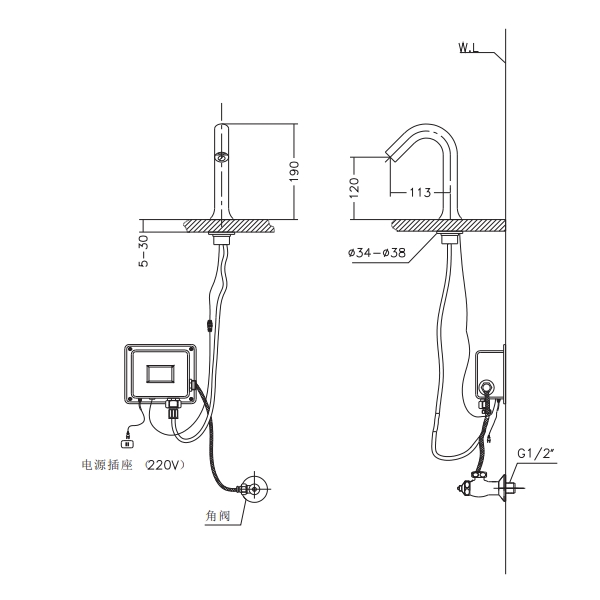 ● 全铜本体 ● 红外线水嘴感应。 ● 气泡出水,每分钟出水量为3L,属于节水型龙头,一级水效。 ● 连续出水60秒自动关闭,以防误感应到盆内杂物。 ● 感应距离出厂设置为20CM,可通过主板按键调节长短。 ● 额定电压:AC220V 50Hz ● 适用水压范围:0.05MPa~0.6MPa