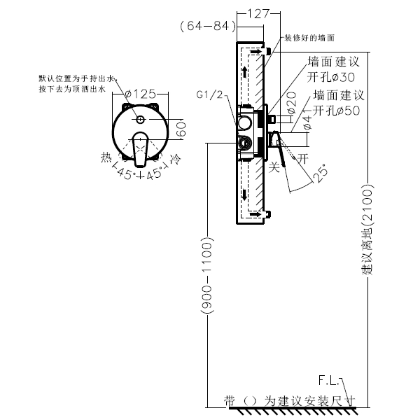 ● 按压切换把手:把手按压即可快速切换顶洒/手持花洒出水阀