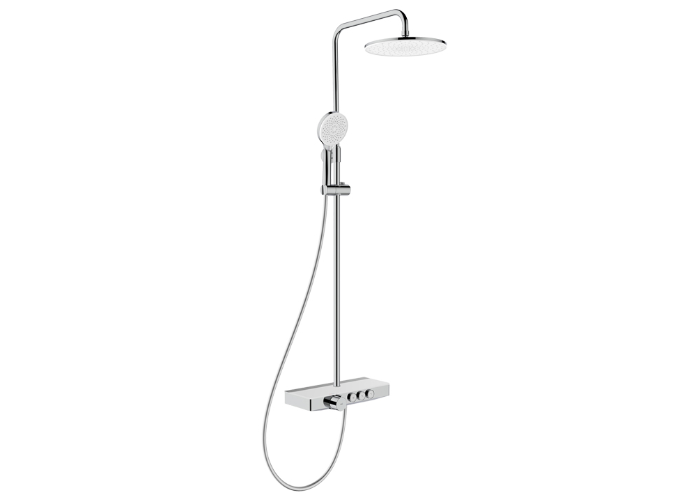 ● 龙头本体采用优质铜材质,抑制细菌生长,耐腐蚀性强, 使用安全无危害 ● 旋转调温,可以根据使用情况自由调节 ● 带下出水嘴 ● 可升降可旋转304不锈钢淋浴柱,调节范围300mm ● 按压式滑座,配三功能手持花洒,花洒出水角度可调 ● 加宽置物平台,光滑美观,满足日常的洗发水沐浴露等置物需求 ● 独立按键式切换,顶洒、手持及下出水可随心切换,洗浴方便 ● 优质表面处理工艺,符合盐雾实验24小时9级标准
