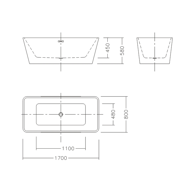 • 浴盆边侧更具防磨职能。 • 大浴缸材質为优享有机玻璃。 • 产品尺寸:1700x800x580 mm。