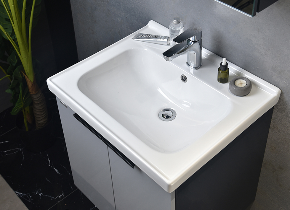 ● 现代极简风,深浅灰色撞色设计,时尚与实用兼得 ● 主柜采用环保多层实木为基材,门板烤漆工艺,防水防潮抗划痕 ● 陶瓷一体盆一体高压成型,抗污釉面方便打理 ● 镜柜为单开门镜面,内部有层板,可分类收纳