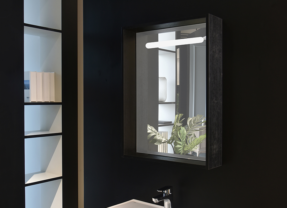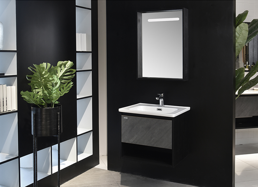 ● 现代简约风格,浴室柜组整体采用多层实木板,表面为三聚氰胺贴面; ● 柜体表面为浅水泥灰色及深灰色,上部为无拉手抽屉,下部为开放式储物空间; ● 陶瓷一体盆一体高压成型,抗污釉面方便打理; ● 镜柜含LED照明功能和除雾功能,底部有开放式储物平台;