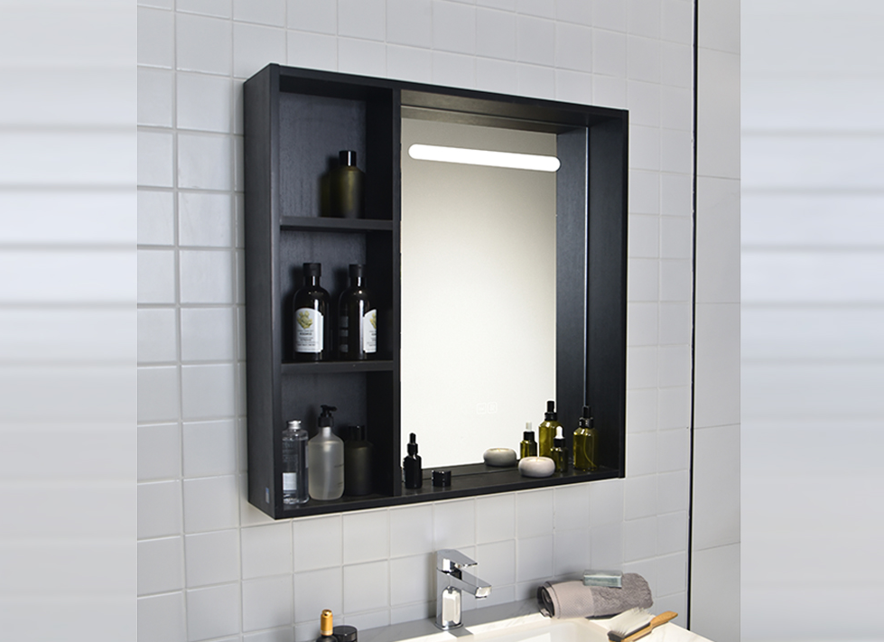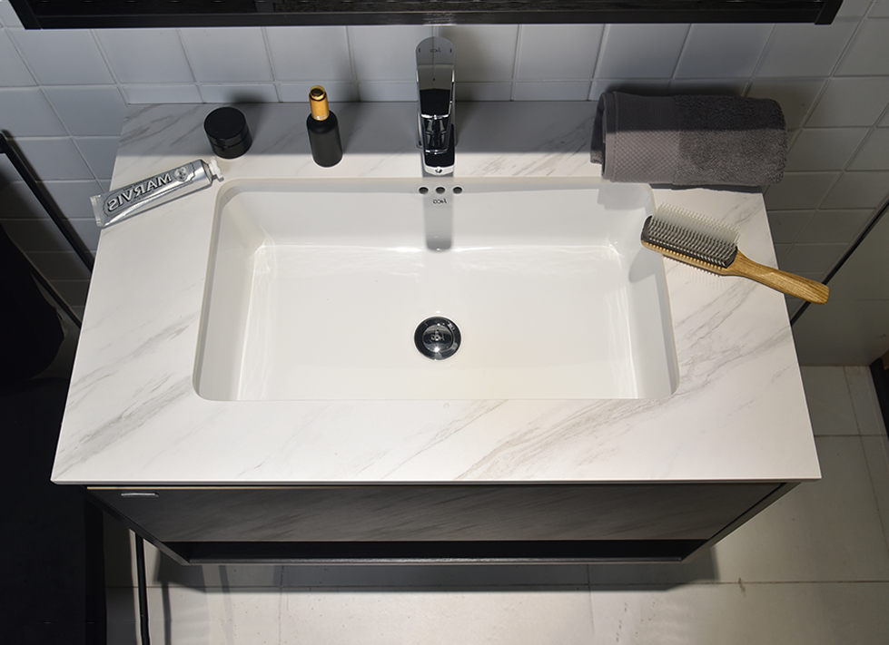 ● 现代简约风格,浴室柜组整体采用多层实木板,表面为三聚氰胺贴面; ● 柜体表面为浅水泥灰色及深灰色,上部为无拉手抽屉,下部为开放式储物空间; ● 台面为岩板材质,抗污耐划;搭配一体高压成型台下盆,抗污釉面方便打理; ● 镜柜含LED照明功能和除雾功能,右侧有开放式储物格;