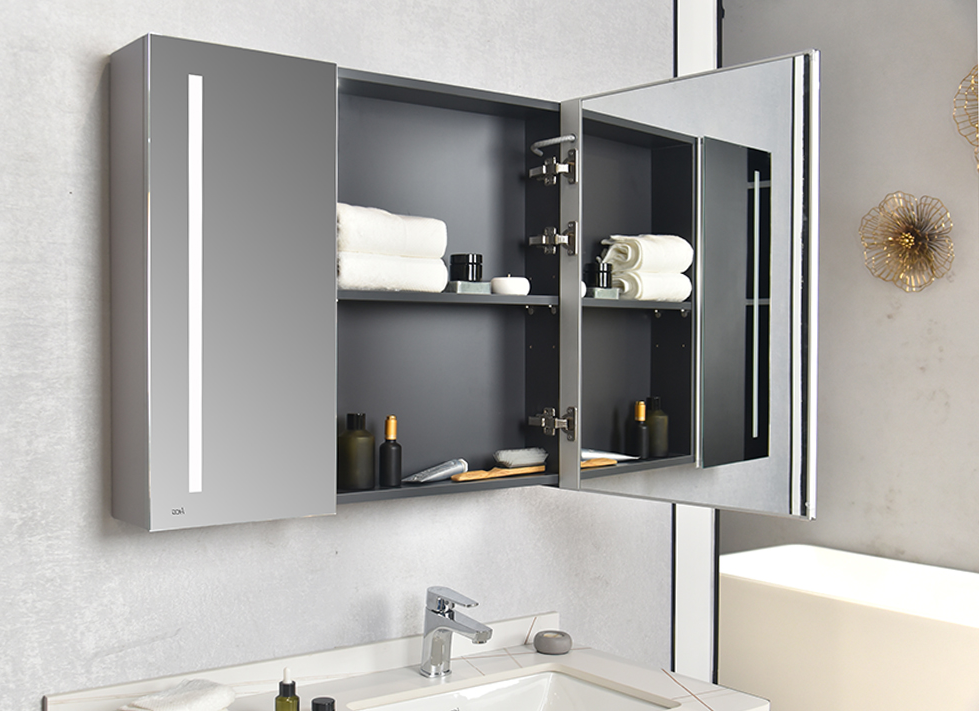 ● 现代简约风格,浴室柜组整体采用多层实木板,主要外观面为亚光漆面; ● 柜体左侧为双抽屉设计,右侧为柜门,门板和侧板分别为浅蓝色和浅紫色亚光漆; ● 台面为劳伦金岩板,搭配台下盆; ● 镜柜为双开门设计,门框采用铝合金边框,双面均附有镜面,并具有除雾和LED照明灯;
